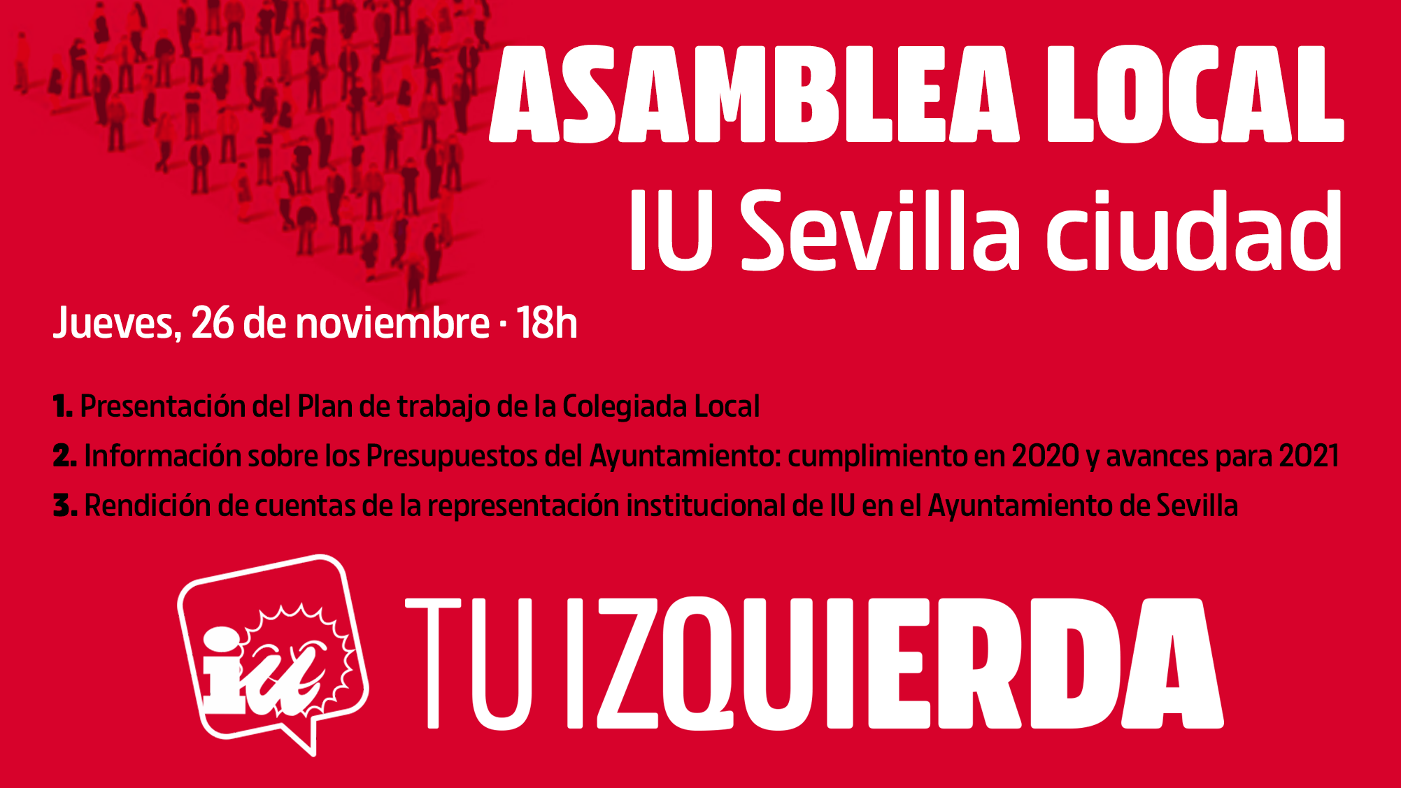 La Coordinadora Local, reunida el pasado 13 de noviembre, aprobó la convocatoria de una Asamblea Local para presentar los objetivos de la nueva Colegiada, analizar de forma conjunta la actualidad política local y facilitar que el Grupo Municipal pueda rendir cuentas ante todas las personas militantes y simpatizantes de nuestra organización en la ciudad de Sevilla.