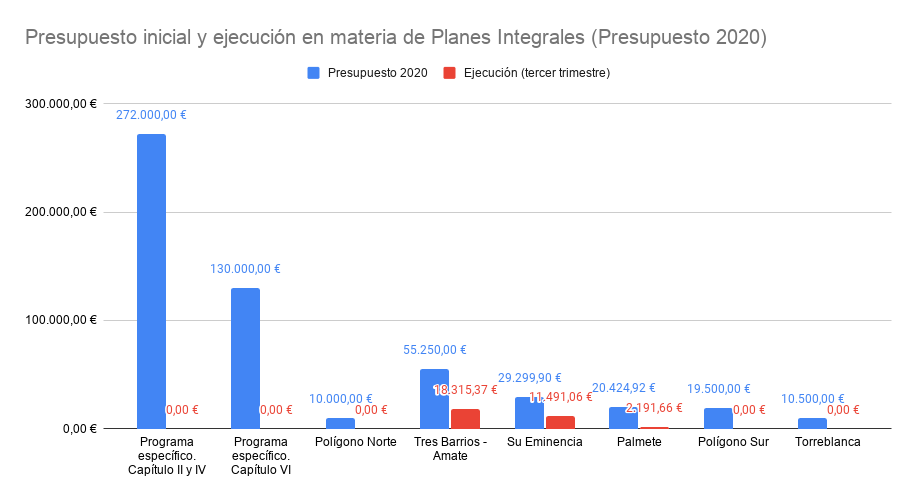 Basta echar un vistazo a la ejecución presupuestaria para comprobar que no se ha llegado ni al 6% de la ejecución en los diferentes programas vinculados a Planes Integrales. En la gráfica de abajo se puede ver cómo sólo se ha ejecutado «algo» en las zonas de Tres Barrios-Amate, Su Eminencia y Palmete. Y lo más escandaloso es que del programa novedoso y recogido gracias al acuerdo entre Adelante Sevilla y PSOE no se ha ejecutado absolutamente nada.